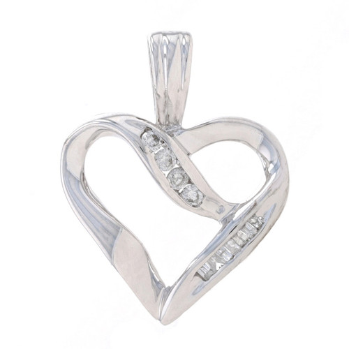 White Gold Diamond Heart Pendant - 10k Round Brilliant & Baguette .15ctw Love