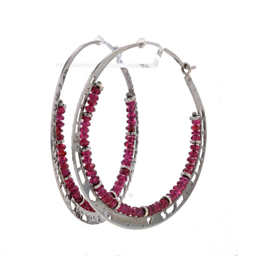 White Gold Garnet Hoop Earrings - 14k Rondelle Black Rhodium Italy Pierced