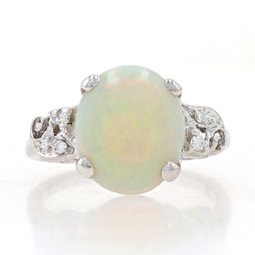 White Gold Opal & Diamond Vintage Ring - 14k Oval Cabochon 2.66ctw Milgrain Sz 6