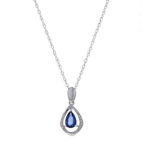 White Gold Sapphire & Diamond Pendant Necklace 17 3/4" - 18k Pear .51ctw
