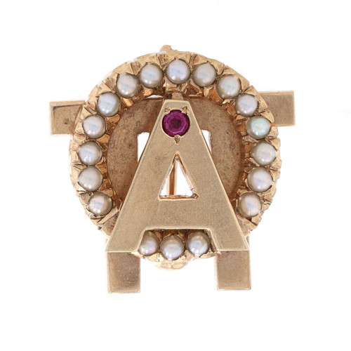 Yellow Gold Alpha Omicron Pi Badge - 10k Synthetic Ruby Pearl 1950 Sorority Pin