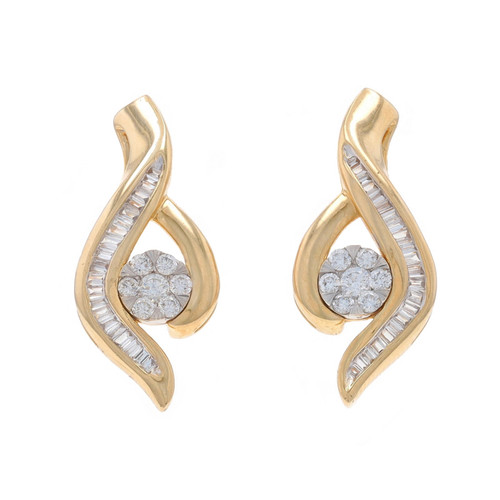 Yellow Gold Diamond Cluster Drop Earrings - 14k Round & Baguette .50ctw Floral