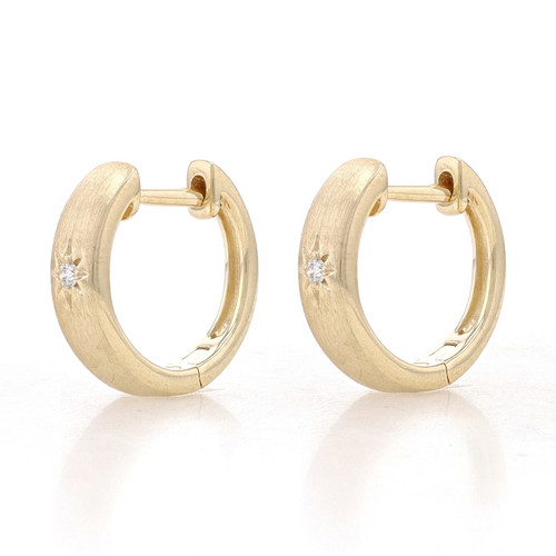 Yellow Gold Diamond Starburst Huggie Hoop Earrings - 14k Round Brushed Pierced