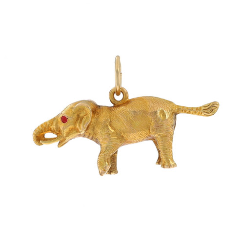 Yellow Gold Garnet Walking Elephant Charm - 14k Round Cabochon Pachyderm Pendant