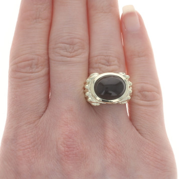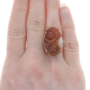 Yellow Gold Jadeite Cocktail Solitaire Ring - 14k Carved Botanical Scroll