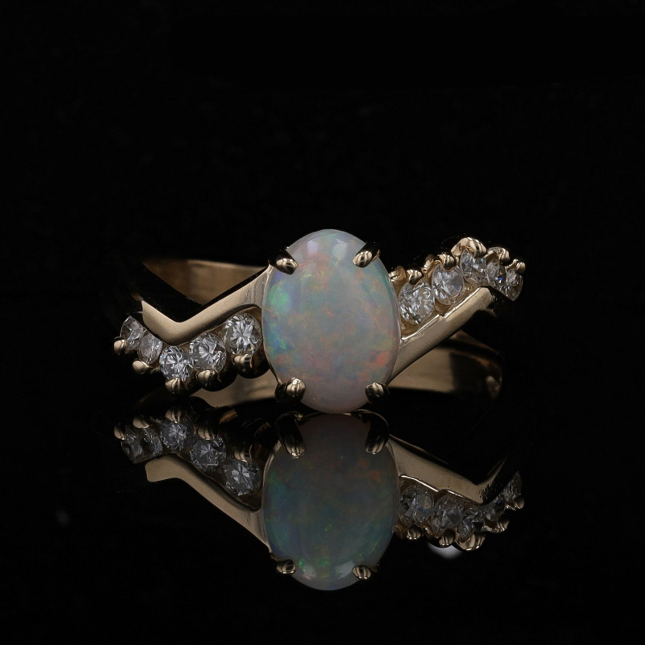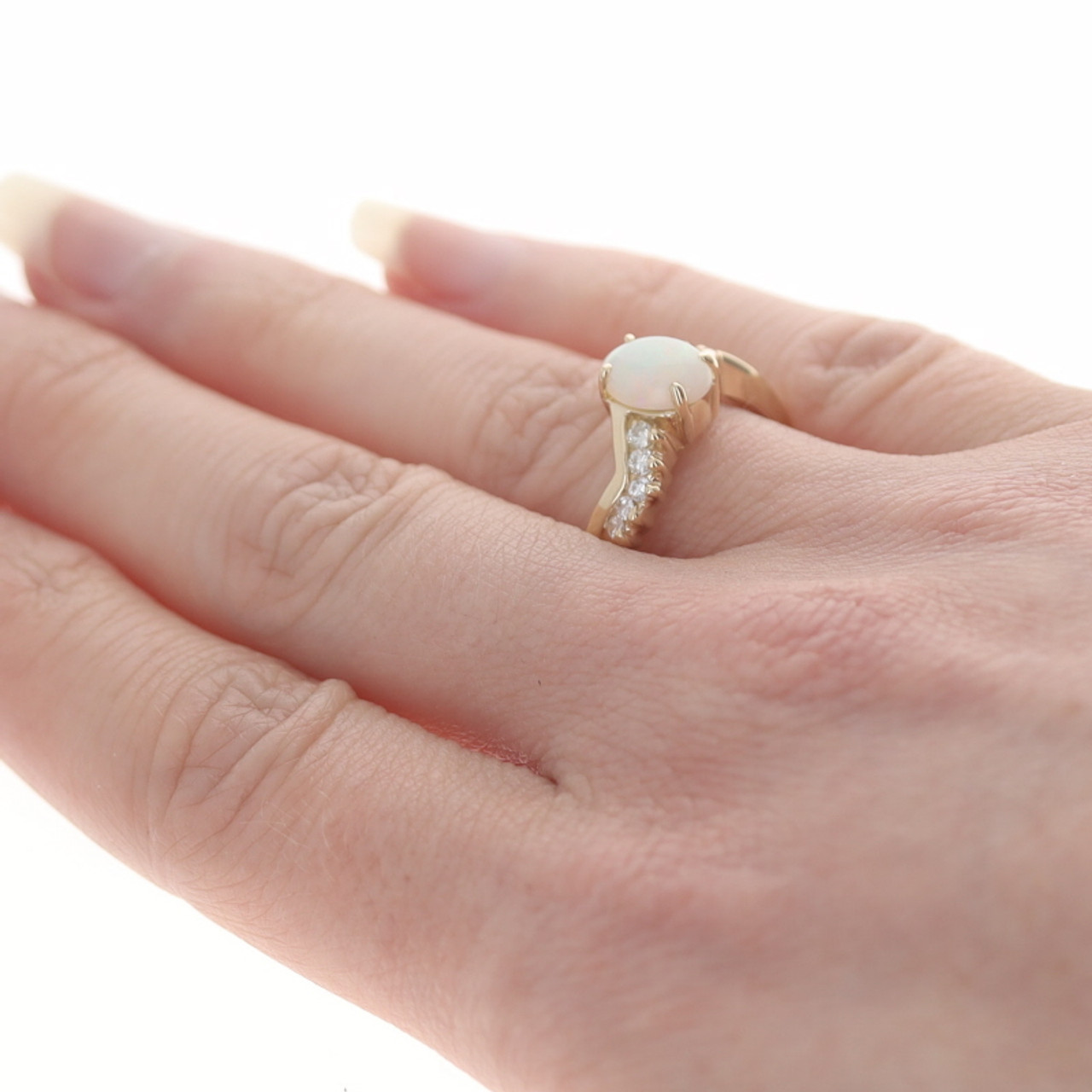 Yellow Gold Opal & Diamond Bypass Ring - 14k Oval Cabochon 1.35ctw Zig Zag