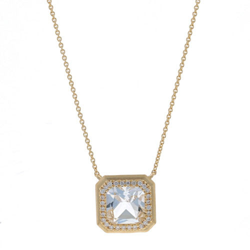 Yellow Gold Quartz & Diamond Halo Necklace -14k Square .14ctw Brushed Adjustable