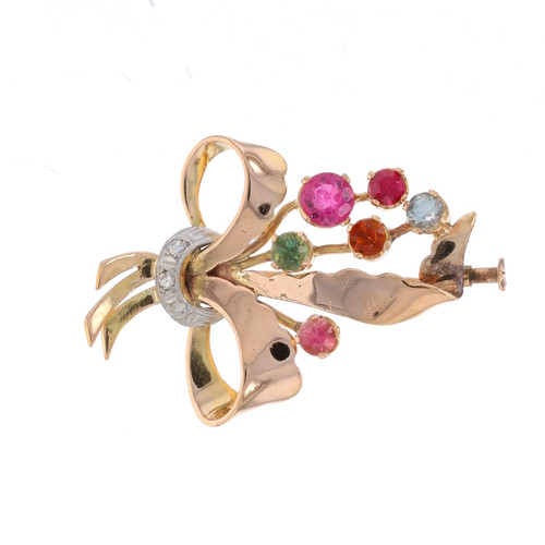 Condition Note: The tourmalines, aquamarine, and citrine display some abrasions from previous wear but they do not affect the brooch's overall vintage beauty or functionality.
