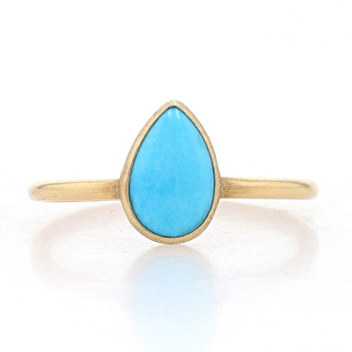 Yellow Gold Turquoise Solitaire Ring - 18k Pear Cabochon Brushed